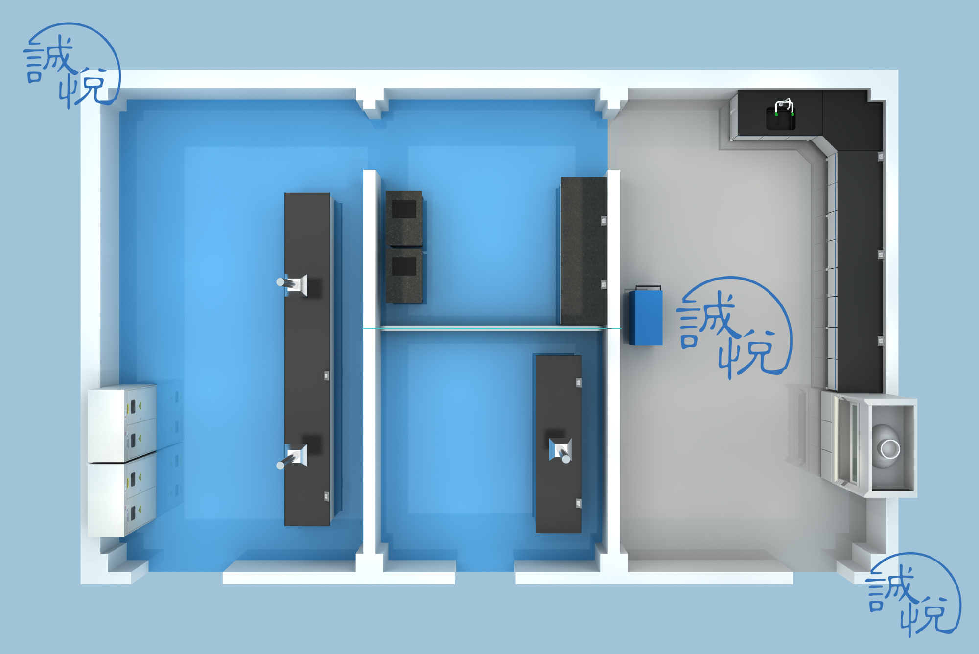 实验室设计前应根据该实验流程来确定仪器的种类、数量、规格型号、外形尺寸、电压功率等参数以及摆放位置,设计师针对性的做出仪器电源、给排水、供气、纯净水以及排风管道接口的设计。根据仪器数量及放置位置确定各区域所需面积,分割有效利用空间。仪器摆放不仅要方便工作,还要考虑地面承重问题。